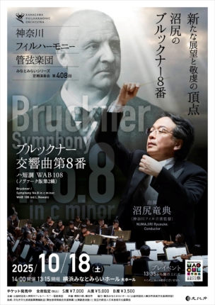 2024年4月定期演奏会、ブルックナー/第5交響曲では音楽監督沼尻竜典の第三の目が開いた名演として多くのブルックナーファンを魅了した。沼尻自身が長い間ブルックナー演奏を温存したが、今が好機であり新たな方向を展望であると大いに期待されている。そして次作品として今演奏会に吟味したのは、後期の名作として人気を博す交響曲第8番。大聖堂の巨大なオルガンが轟くように充実した3管編成に、ハープ、ワーグナー・テューバを加えた色彩豊かな神奈川フィルの響きは、敬虔なるブルックナー音楽の頂点となる。
